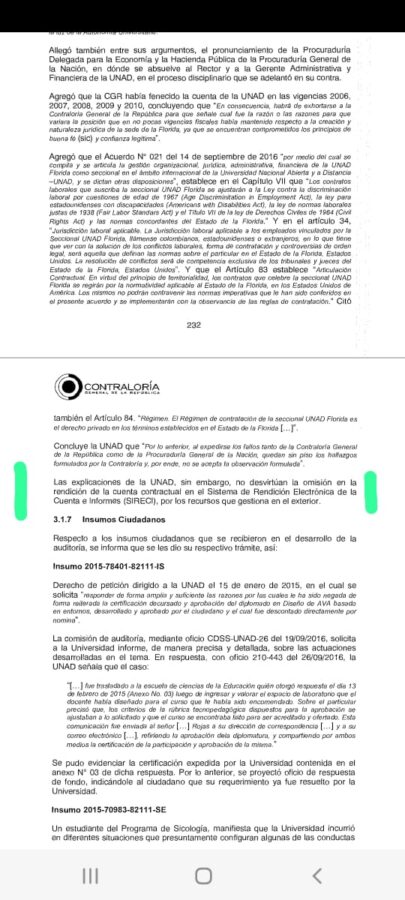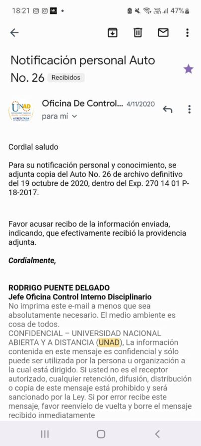 Por supuesto que mi contrato solo duró un año, según lo pactado en el plazo inicial, y no tuvo renovación. Hice preguntas incómodas, advertí por el sistema de revisión contractual de la UNAD de las incoherencias en los procesos y al final, ante uno de los casos donde me pidieron (sin que accediera a hacerlo) tramitar una solicitud de otrosí a pesar de ser un contrato ya vencido, remití queja a la Contraloría General de la Nación y al Ministerio de Educación sin tener éxito alguno. Pues las entidades remitieron por competencia a la Oficina de Control Interno Disciplinario de la misma UNAD y allí realizaron el archivo en 2020, 5 años después de haber presentado la queja.