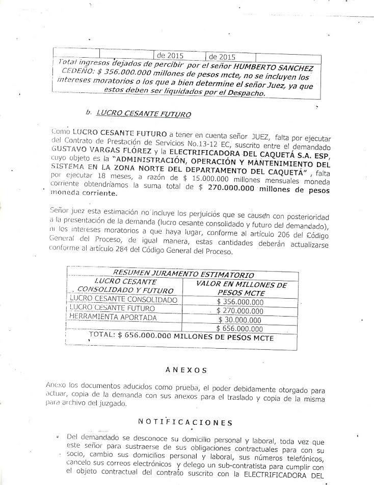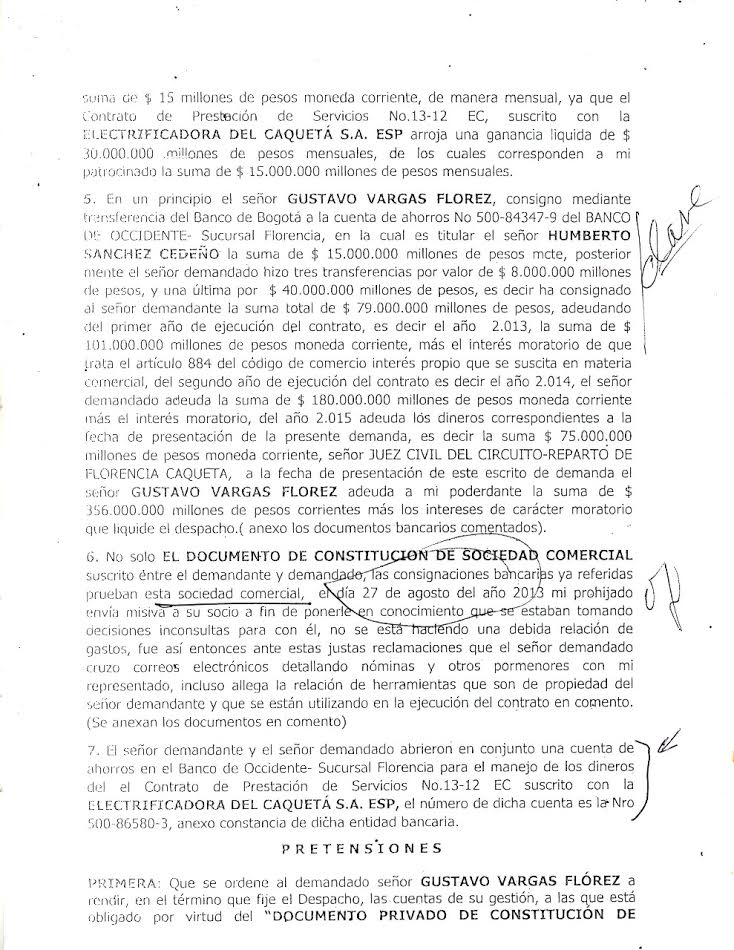 Por estimar que el socio dos, Gustavo Vargas Flórez, no le ha rendido cuentas y no le ha dado participación de las ganancias, el actual alcalde, el señor Humberto Sánchez, a través de apoderado judicial, el día 22 de mayo de 2015, presentó demanda civil contra del ingeniero Vargas (socio dos), quien en la redacción de los hechos de la demanda, afirmó y confirmó todos los hechos mencionados en este artículo; además, estimó que las ganancias dejadas de percibir sumaban 30 millones mensuales, de las cuales, según Sánchez Cedeño, de las que la mitad le corresponden a él y que, en definitiva, por lucro cesante (consolidado y futuro), se le debían, de este millonario contrato, al funcionario público, la suma de $ 656’000.000