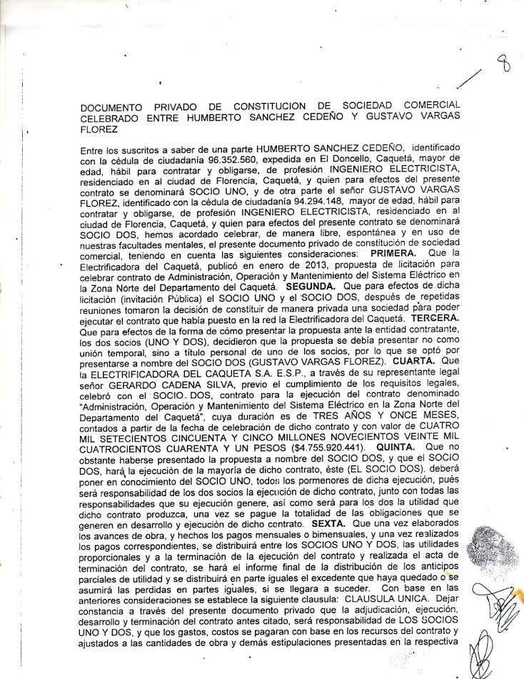 El objeto de dicha sociedad era la suscripción del contrato administrativo N° 13-12 EC, que se celebró entre Gerente General de la Electrificadora del Caquetá SA ESP y la sociedad representada por Gustavo Vargas Flórez (socio dos del actual alcalde), el cual tenía como propósito la “administración, operación y mantenimiento del sistema eléctrico en la zona norte del departamento del Caquetá”, por una cuantía de $ 4.755’920.441. El acta de inicio de dicho contrato data el día 01 de febrero de 2013, con vigencia de tres años y once meses, es decir que dicho contrato tenía terminación en diciembre de 2016, fecha para la cual Sánchez Cedeño se había inscrito y electo alcalde del municipio de San Vicente del Caguán.