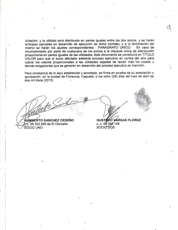 El día 08 de abril de 2013, se firmó y aprobó un documento donde se constituía una Sociedad Comercial celebrada entre el hoy alcalde de San Vicente del Caguán, Humberto Sánchez Cedeño y Gustavo Vargas Flórez. En esta, el entonces contratista se suscribió como el socio número uno, mientras que su compañero era el socio dos.