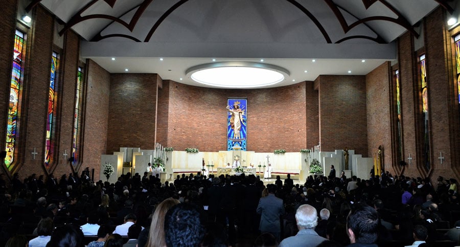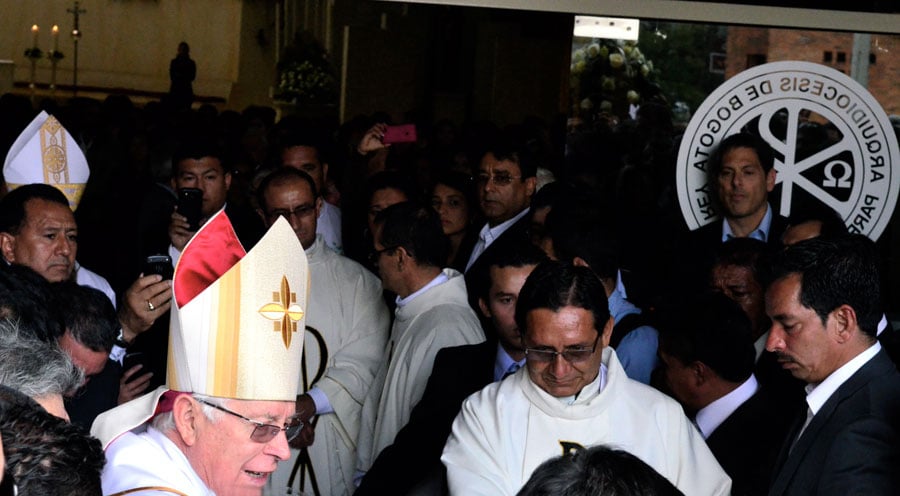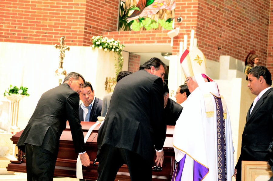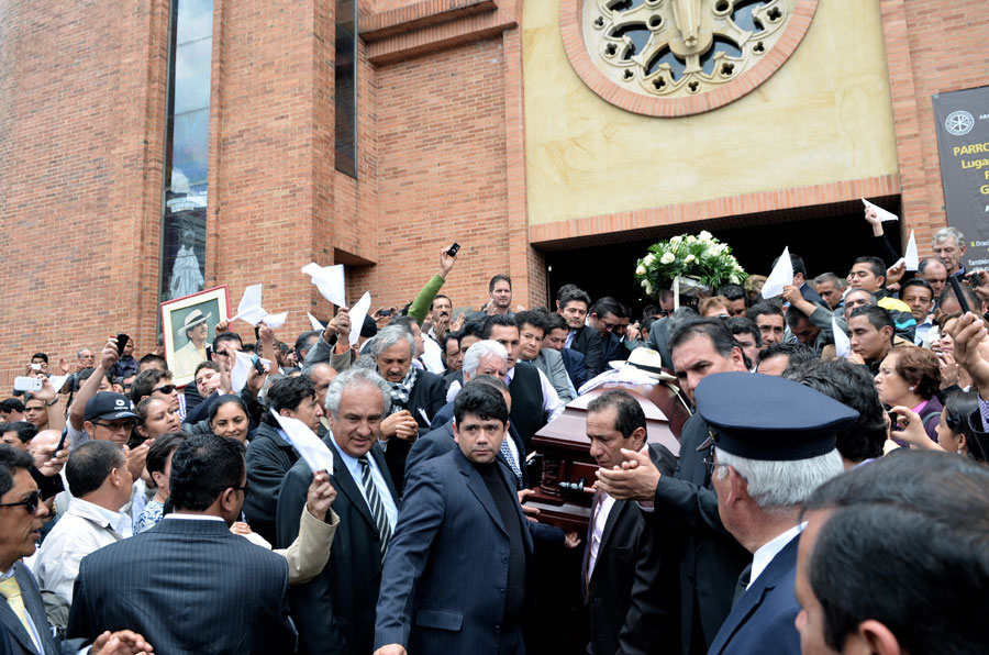 En las escalinatas de la parroquia lo esperaban con agua bendita para lavar las culpas: un obispo, seis curas y dos sacristanes. El féretro fue colocado por sus guardaespaldas en la nave de mármol presidida por su retrato en la posición perfecta para que monseñor Héctor Gutiérrez Pabón, el obispo de Engativá y unos de sus dos confesores, dijera su prolongada y elogiosa homilía.