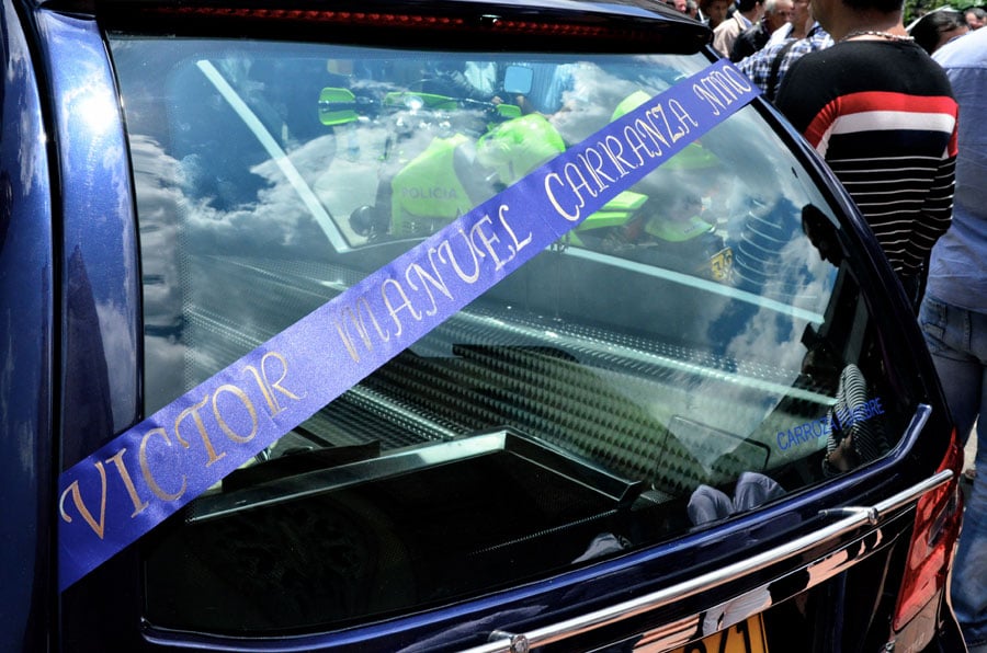 El ataúd sale de la Funeraria Gaviria cargado por dos escoltas pensionados, dos amigos y dos hijos de Carranza. Por los aires de aquella mañana soleada sobrevuela un helicóptero con personal de seguridad pero, además, casi a ras de los techos hay un drone, una aeronave no tripulada de unos 70 centímetros de espesor, la cual lleva consigo una cámara que emite imágenes a un circuito cerrado de televisión de la familia. A 65 pasos está la parroquia Cristo Rey donde se realizará el réquiem. La senda que conduce de funeraria a la capilla puede durar un minuto, pero la multitud intentando tocar el cajón la hace tardar más de siete minutos. Seiscientas personas sentadas lo esperan dentro de la iglesia y otras quinientas de pie. Un perro antiexplosivos olfatea hasta la bolsa de las limosnas.