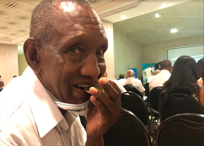 En el salón estaban apostadas más de 30 viejas glorias del deporte colombiano como él a los que la directora de Coldeportes Clara Luz Roldan homenajeó...” para que a nadie se le olvide quien puso las bases “ dijo ella al colgar las medallas, las más recientes, a los campeones .