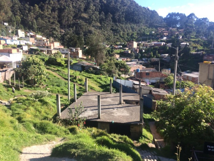 Una virgen dentro de una vitrina de vidrio adornada con flores, posa sobre una piedra blanca que dice “Bienvenidos Barrio Bosque Calderón Tejada” en color azul rey. El contraste es inevitable. Hacia el occidente se alcanzan a ver edificios de ladrillo, modernos, altos, construidos con cuidado. Hacia el oriente, casas improvisadas en distintos materiales y con puertas de colores sobre terrenos que han cedido al peso de las construcciones. En el barrio Bosque Calderón viven más de 30,000 personas pero ya no viven los Samboní.