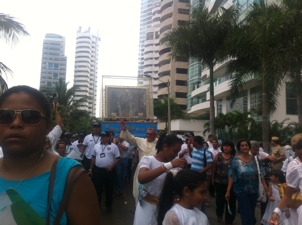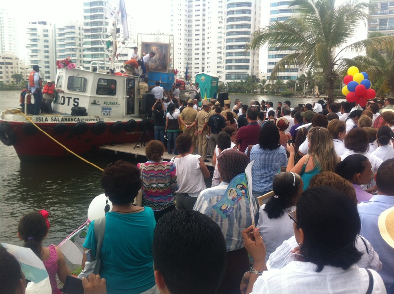 Después de 27 días de recorrido por el río Magdalena, la imagen de Nuestra Señora del Rosario de Chiquinquirá llegará hoy en la tarde a Pasacaballos, Bahía de Cartagena. Será recibida por el presidente de Ecopetrol, Javier Genaro Gutiérrez; el alcalde de Cartagena, Dionisio Vélez y Monseñor Jorge Enrique Jiménez Carvajal, arzobispo de la Arquidiócesis de Cartagena, quien ofrecerá una eucaristía por la llegada de la Virgen Peregrina que viaja con la Redprodepaz a la ciudad amurallada. Hoy culmina el recorrido fluvial por el río Magdalena, mañana continúa la peregrinación por vía terrestre, pasando por los municipios de Santa Lucía, Suan y Candelaria del departamento de Bolívar, y el día lunes 14 de octubre llegará al departamento del Atlántico pasando por los municipios de Manatí, Campo de la Cruz, Repelón, Santo Tomás y Sabanagrande. La última estación de la Virgen es la Plaza de la Paz en la ciudad de Barranquilla el próximo sábado 19 de octubre. Anuncios. Anuncios..