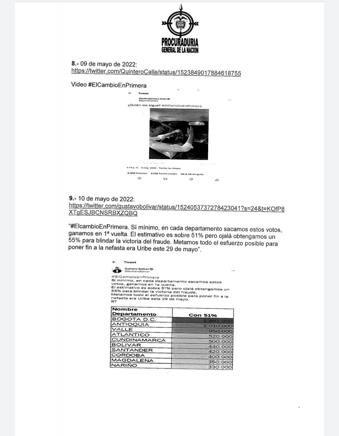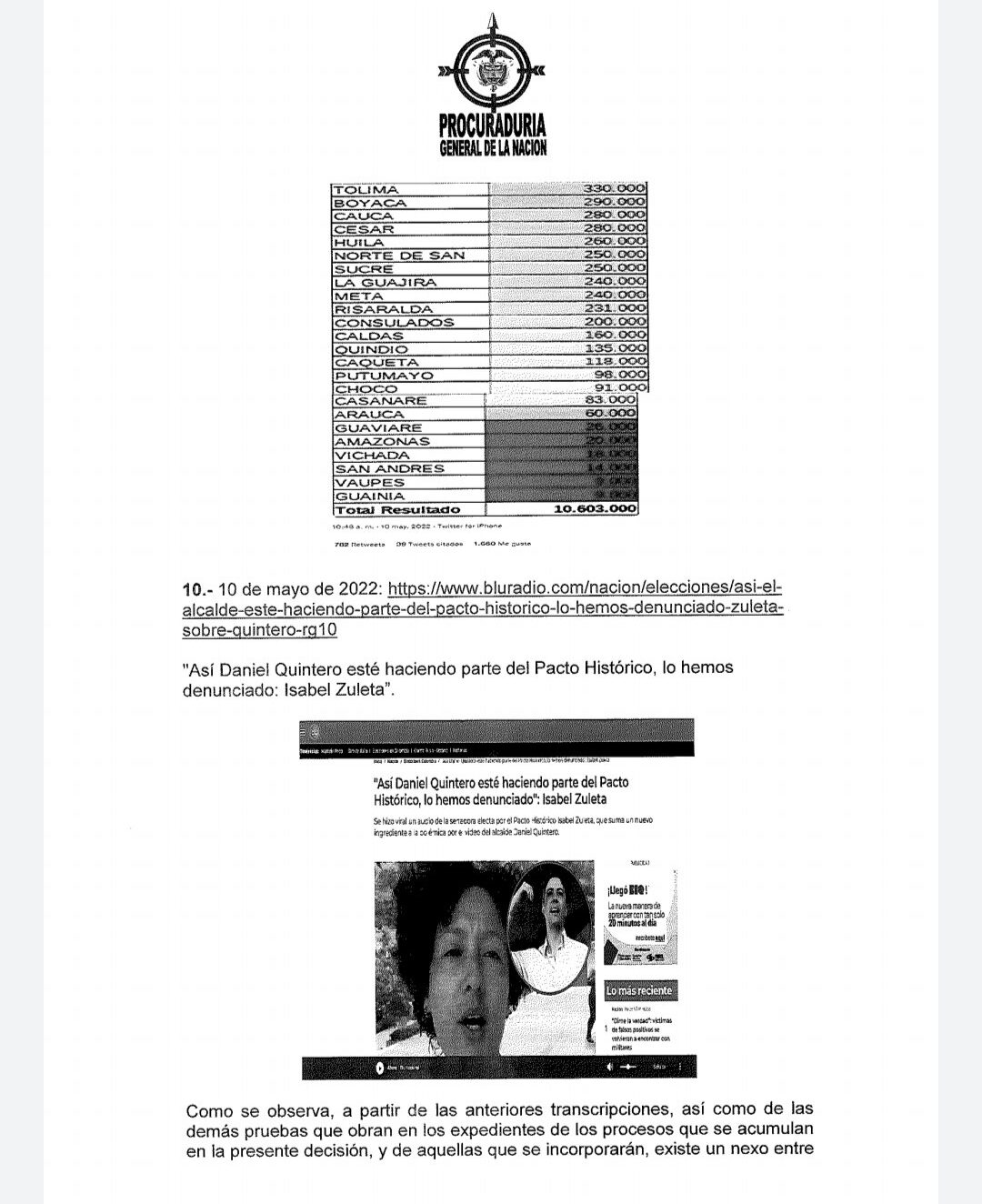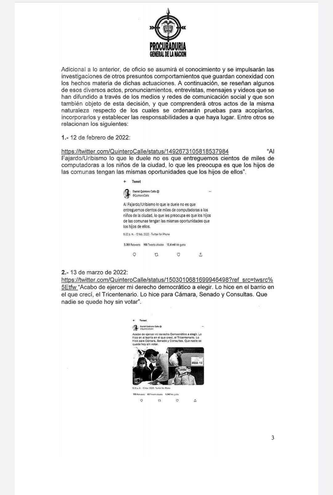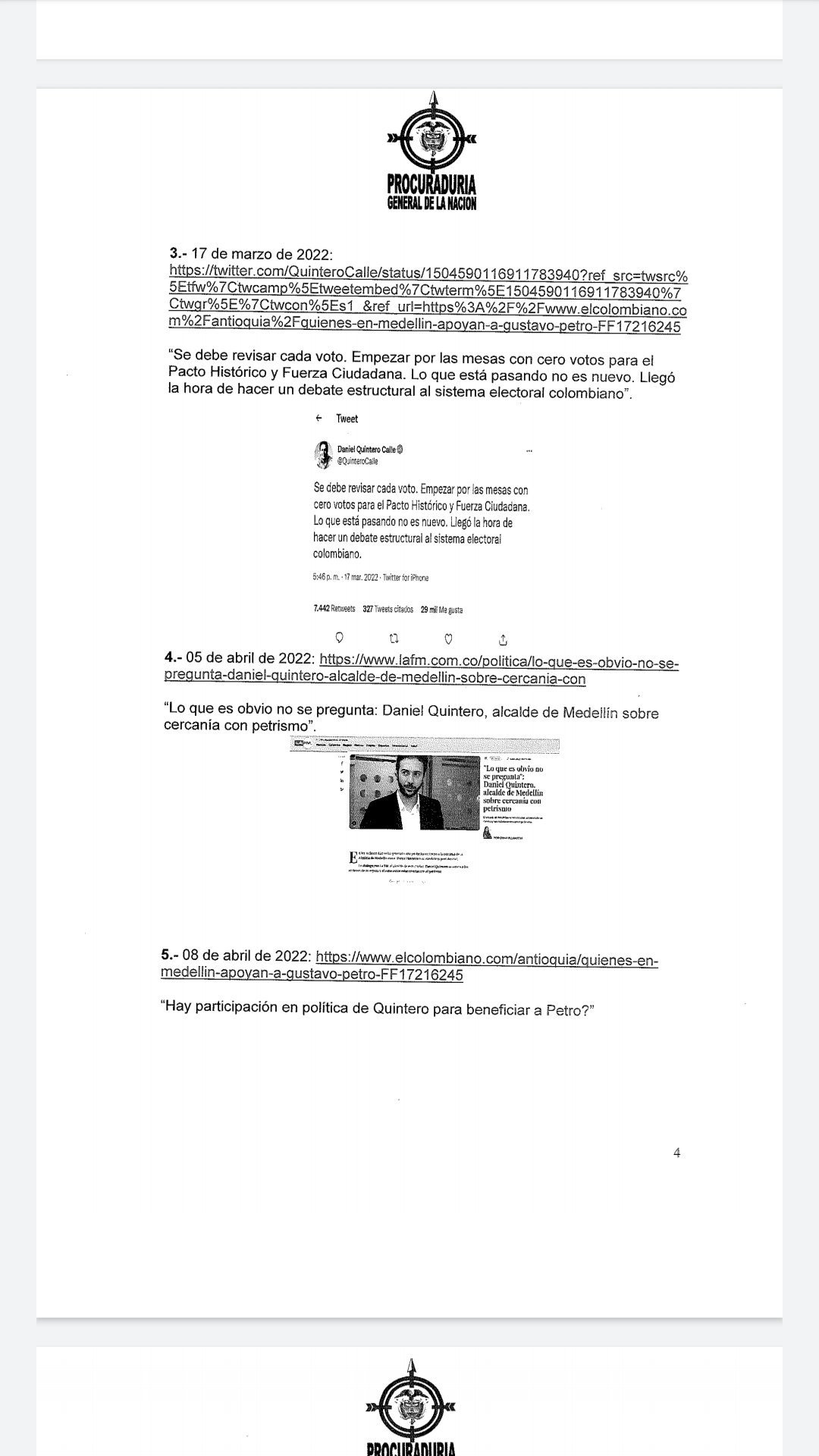 Hace tres días, la procuradora Margarita Cabello suspendió del cargo al alcalde Daniel Quintero por participar en política. La decisión fue tomada después de que el mandatario publicará un video en apoyo a Gustavo Petro en donde aseguraba que el Cambio -slogan de la campaña del candidato del Pacto Histórico- ganaría en primera vuelta. Sin embargo, el dossier también contempló otras nueve situaciones en las que el alcalde de Medellín se habría metido en política en medios de comunicación, entrevistas, mensajes y publicaciones en sus redes sociales. Entre sus mensajes, se tomó en cuenta cuando el alcalde felicitó a los funcionarios que renunciaron a su gabinete para adherirse a la campaña de Petro, Quintero calificó esto como lo mejor que podían hacer en su lucha por el cambio.