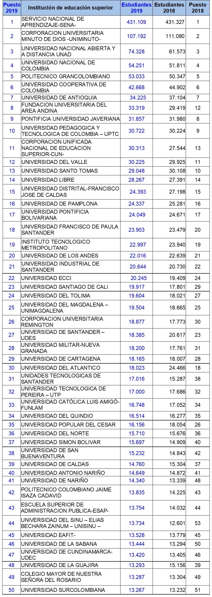 Durante 2019 y 2018, el Sena, la Universidad Minuto de Dios, La Unad, la Universidad Nacional y el Politécnico Gran Colombiano, han ocupado las cinco primeras posiciones como Instituciones de Educación Superior (IES) más grandes del país, en cuanto a número de estudiantes de pregrado y posgrado. Los primeros siete puestos, que completan la Cooperativa y la Universidad de Antioquia, no tuvieron cambios.