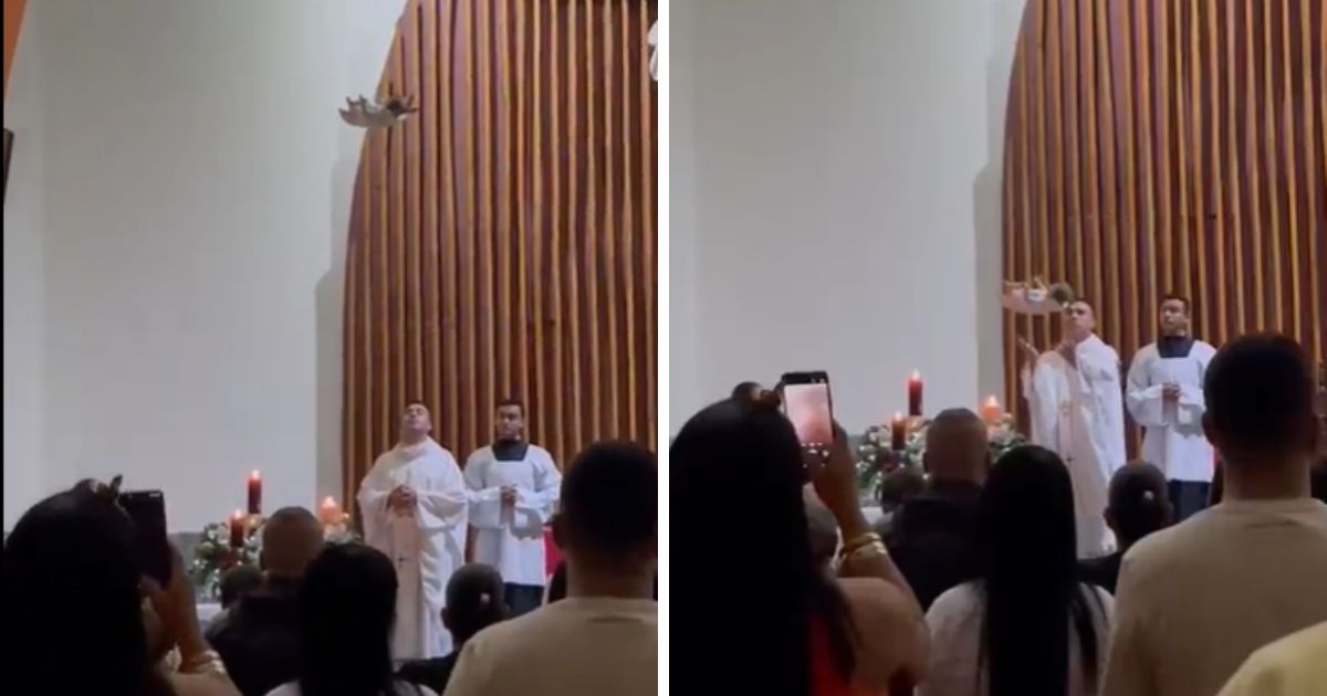 En el clip, publicado por un asistente a la misa, se ve como del techo de la iglesia desciende un bebé de juguete atado a una cuerda, simulando el nacimiento de Jesús, y cuando se encuentra cerca del altar y del sacerdote, este se acerca para tomarlo.