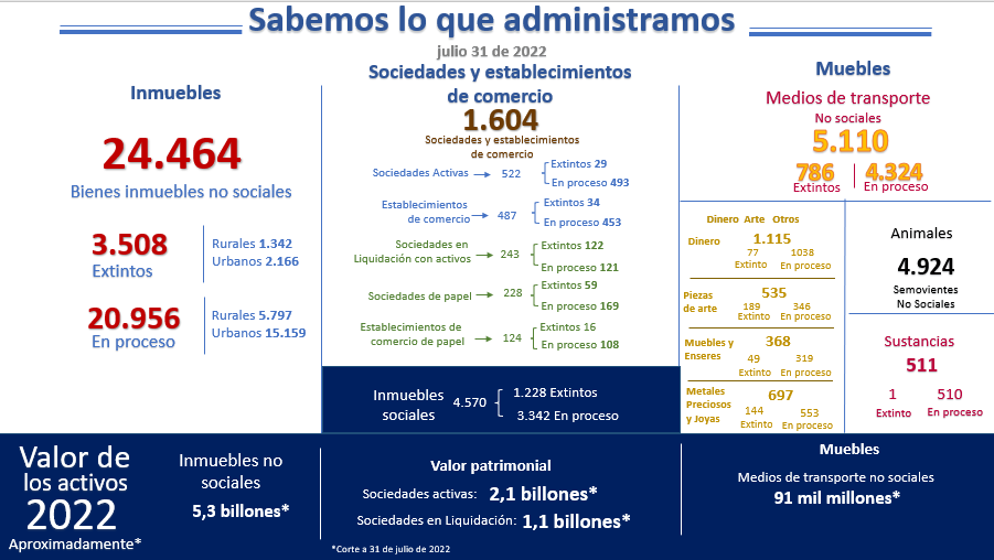 Según el documento la SAE, de los más de 35 mil bienes que esta entidad administra, solo puede vender y usar un poco más de 10 mil, que son los que están extintos y hacen parte de los activos del Estado. Los otros 25 mil son bienes que siguen en medio de largos y costosos procesos jurídicos para quitárselos a la mafia que hace todo tipo de maromas para no perderlos.