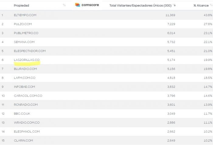 La medición de Comscore ubicó al portal Las2orillas.co como el sexto más consultado del país y segundo nativo digital después de Pulzo.com. Este es ranking de medios más visitados en Colombia (top 10) con corte a septiembre de 2020: