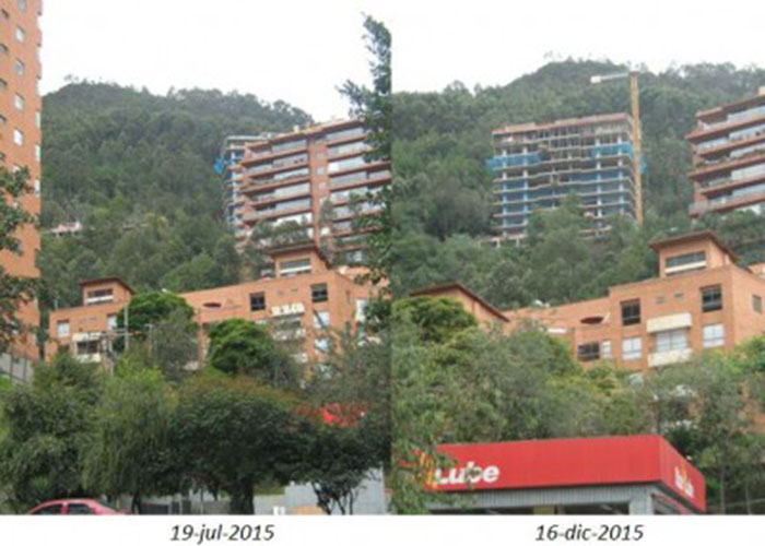 En contraste, en cuestión de apenas seis meses los constructores de la ampliación del conjunto residencial Cerros de los Alpes, en Usaquén (entre calles 121 y 125), levantaron, con ayuda de una potente grúa, un edificio de 10 pisos que se ha comido media montaña ante la negligencia de las autoridades y el silencio de los medios masivos de comunicación.