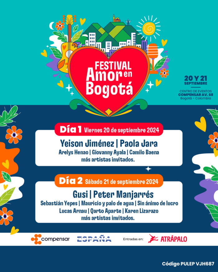 Las reconocidas empresas, Compensar, la Caja de Compensación Familiar con su renovado centro de eventos, España Entertainment, especializada en booking de artistas y know-how en eventos, y Atrápalo, la agencia online líder en viajes y entretenimiento, se complacen en anunciar la primera edición del Festival "Amor en Bogotá". Este evento se llevará a cabo los días 20 y 21 de septiembre de 2024 en la Plaza de Eventos Compensar, ubicada en el complejo de la sede de la Av. 68.