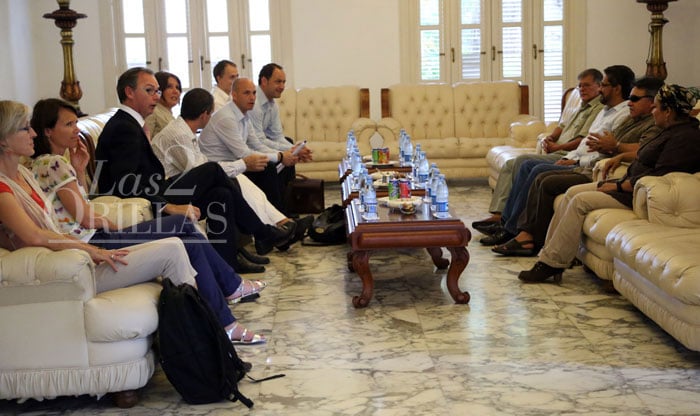 Iván Márquez responde preguntas a un equipo periodístico europeo. Andrés Paris, jefe de comunicaciones de la delegación, calcula que han respondido más de un centenar de entrevistas a medios nacionales e internacionales.