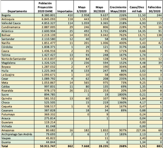 El cuadro siguiente muestra el comportamiento del Coronavirus en los 32 departamentos del país, dando cuenta del número de contagios “importados” con los que comenzó la expansión de la pandemia en cada región. Igualmente aporta una información importante y es el número de casos de contagios por 10 mil habitantes en los que sobresalen, Bogotá, Bolívar, Meta y Amazonas.