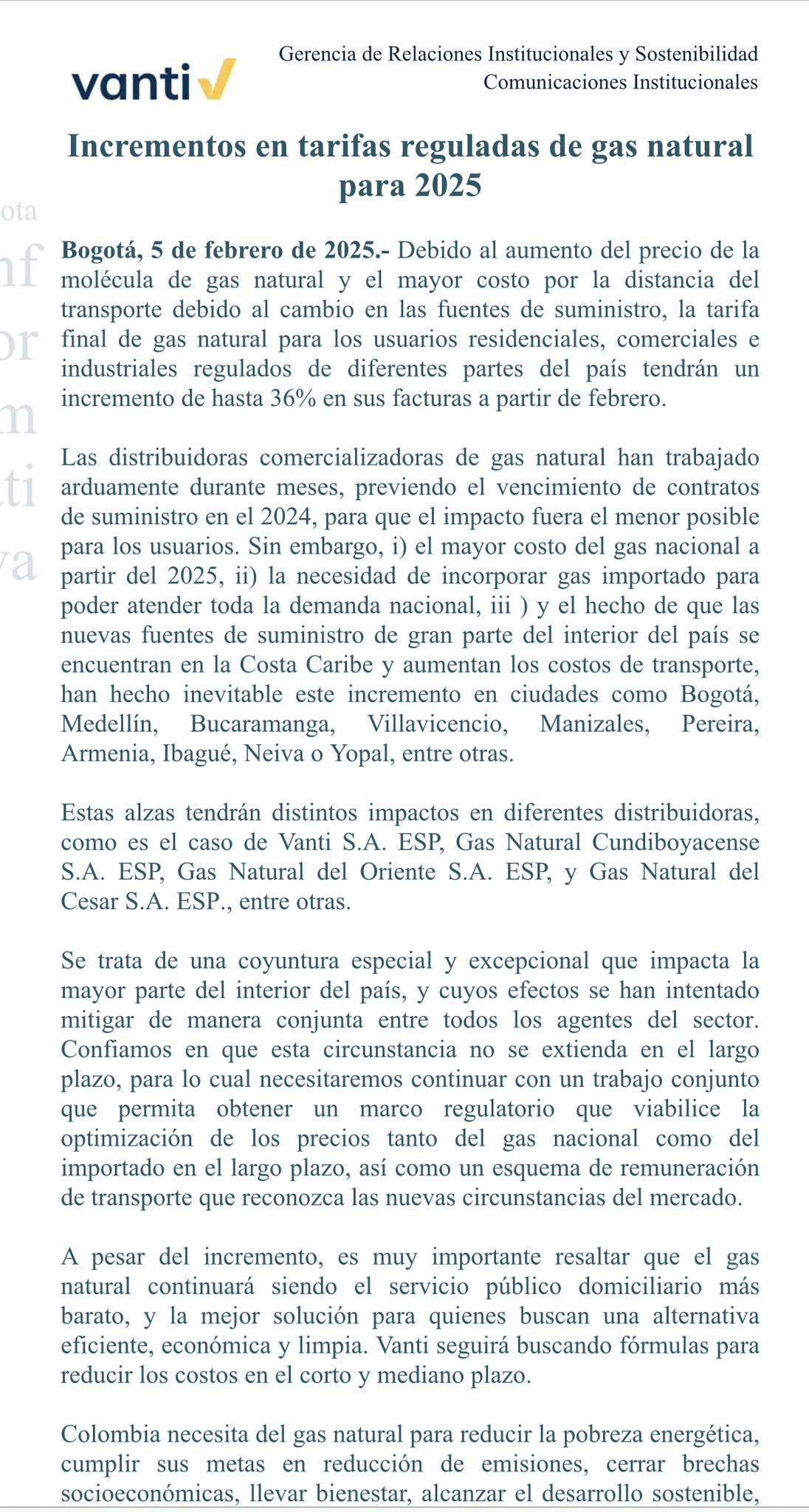 La compañía propiedad del fondo canadiense Brookfield fue la encargada de emitir el comunicado, pero en este mismo menciona que hay otras que también se ven afectadas por las alzas del transporte y que actuarán en consecuencia. Estas son Gas Natural Cundiboyacense, Gas Natural del Oriente, y Gas Natural del Cesar, todas pertenecientes al Grupo Vanti y, por tanto, propiedad también de Brookfield.