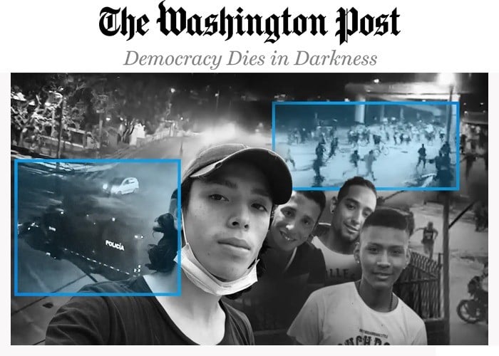 El Washington Post, el tradicional diario de Jeff Bezos, sacó un impresionante informe de los casos de muchachos asesinados por la Policía en Colombia. Las caras de Marcelo Agredo, de 17 años; Santiago Murillo, de 19; Brayan Fernando Niño y Nicolás García, abrían el artículo que presentaba los cuatro videos donde se veían los abusos que impresionaron a todo el mundo.