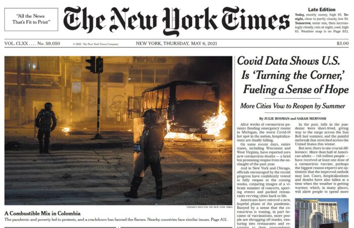 El 6 de mayo el diario estadounidense The New York Times abría su edición impresa con una foto que mostraba el caos de Colombia. La escena casi postapocalíptica fue captada por el fotógrafo colombiano Federico Ríos, un manizalita que con su cámara al hombro se ha metido en la Colombia profunda y ha contado lo que otros no. Siguió a las Farc desde hace once años en un trabajo que no se ha detenido y, durante el paro, ha logrado mostrarle al mundo un país agobiado por la crisis.