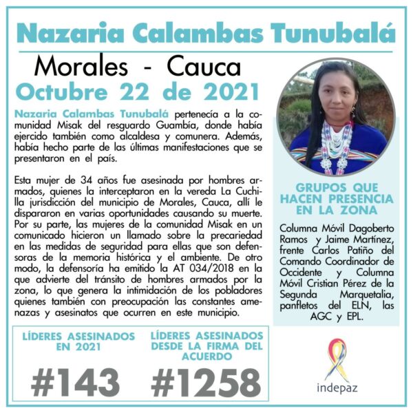 Nazaria es la tercera mujer Misak asesinada desde abril del 2021 y la lideresa social numero 143 asesinada en Colombia en lo corrido de este año, de acuerdo a los datos de Indepaz.