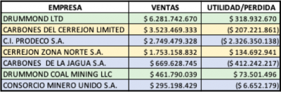 A estos tres grupos empresariales, le pertenecen siete de las nueve empresas extractoras de carbón que figuran entre las mil empresas más grandes del país, pero donde solo Drummond generó utilidades en 2019