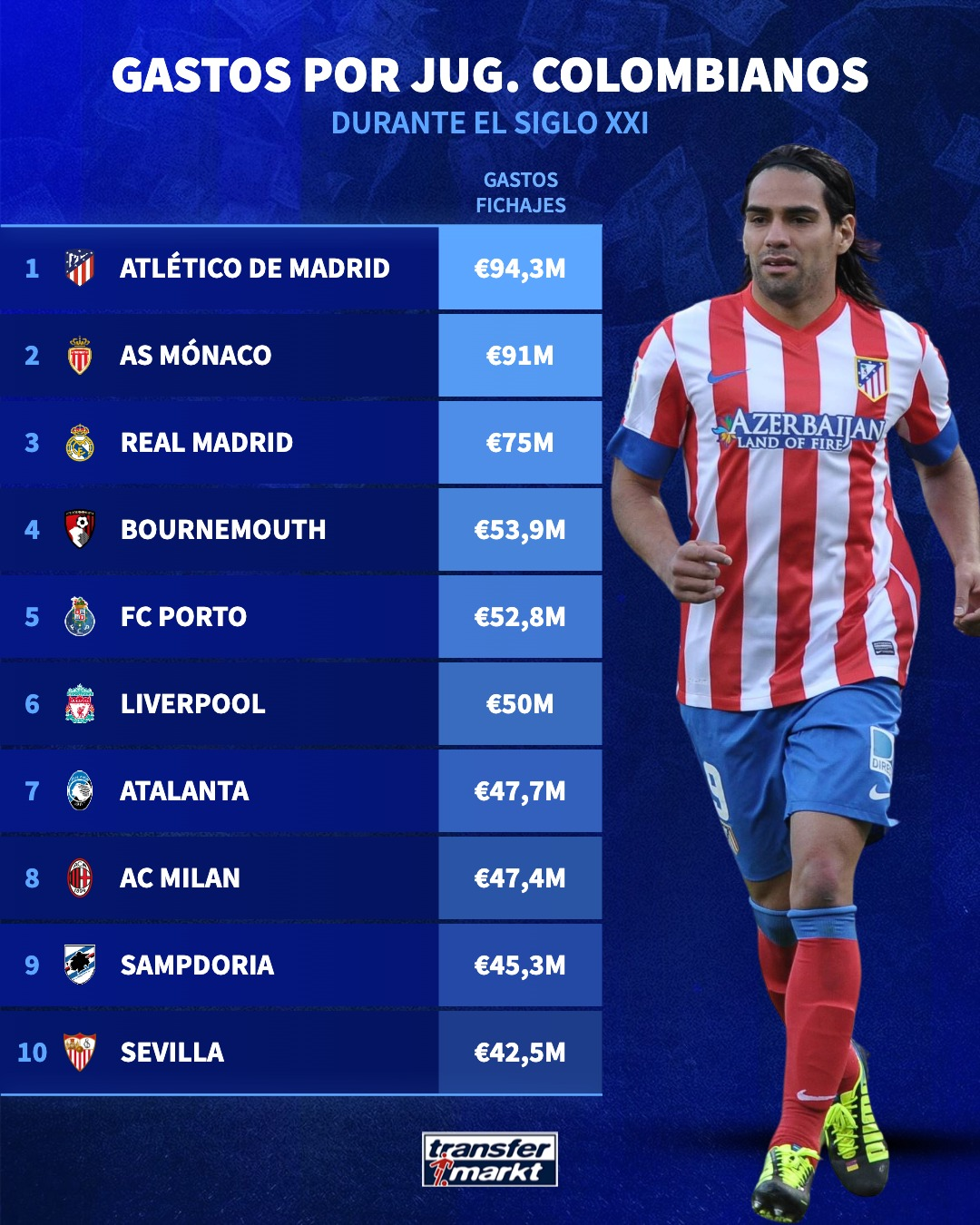 En el último top que publicó TransferMarkt, portal especializado en el mercado de fichajes, quedaron al descubierto los equipos de fútbol que más plata han gastado en la contratación de jugadores colombianos. En el ranking aparecen clubes de gran fama como AC Milán, Real Madrid o Mónaco; pero ninguno de ellos supera a Atlético de Madrid, el club español que, al menos en el último siglo, ha sido el que más ha confiado en el talento del jugador colombiano, contratando a futbolistas de gran reconocimiento como Radamel Falcao.