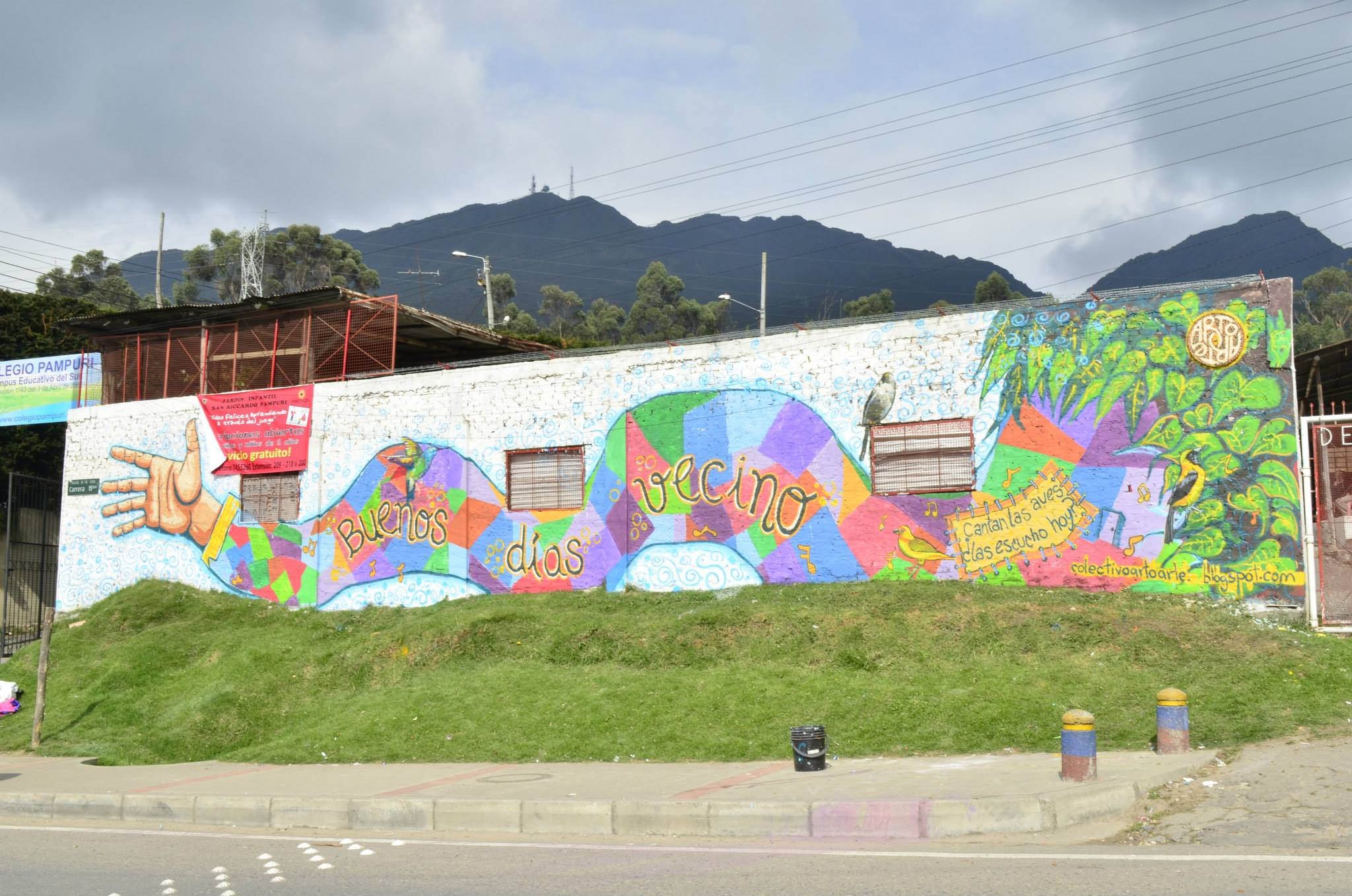 La lluvia vuelve a arreciar y la sombrilla se desmaya con el viento que desciende desde las laderas de la montaña. Así que el resto del trayecto lo hacemos al natural. En el muro de entrada del Colegio San Cayetano en el Barrio Juan Rey, un gran anuncio en una serpentina de colores da la bienvenida: Buenos días vecino. El mensaje da justo en la cara de los que a esa hora van a trabajar y se asoman por la ventana del bus. —Esta fue idea se nos dio en una noche de insomnio. Nos pareció importante dejar un mensaje que fuera familiar para todo el que lo leyera y de esa forma integrar el trabajo al barrio—.