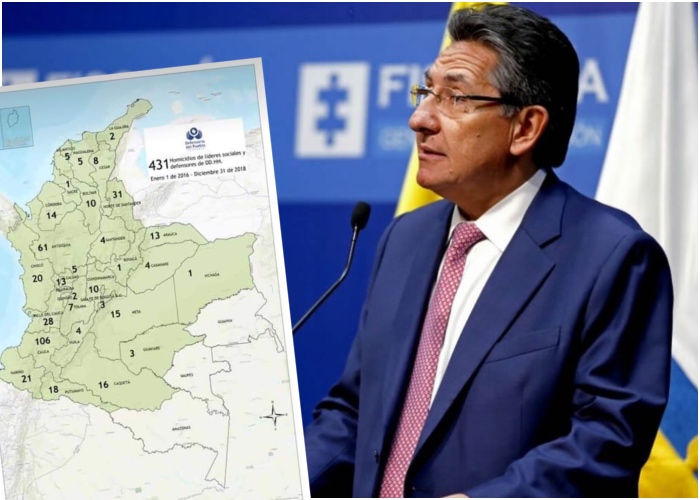 El fiscal Néstor Humberto Martínez reconoció que sí existe una sistematicidad en el asesinato de líderes sociales, aunque aclaró que no se trata de un solo actor el que está detrás, sino varios agentes que actúan de manera independiente. Según datos de la Defensoría del Pueblo, encabezada por Carlos Negret, entre enero de 2016 y diciembre de 2018 fueron asesinadas 431 personas. Y es que Martínez aseguró que los principales actores que están detrás de los líderes sociales son el Clan del Golfo, Los Caparrapos y la guerrilla del ELN, mismo señalamiento que hizo el alto comisionado de paz Miguel Ceballos sobre estos últimos, que negaron la acusación.