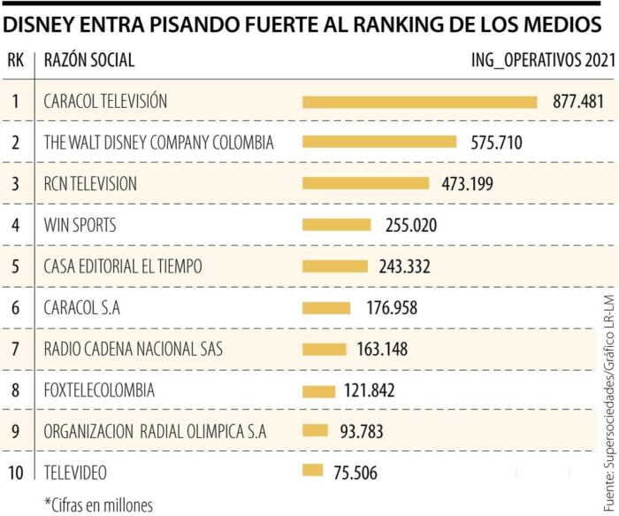 Precisamente, una de las sorpresas es el caso del gigante norteamericano Disney (The Walt Disney Company Colombia) que, con poco tiempo en el terreno local —poco más de un año— aventajó a varias empresas tradicionales en el contexto colombiano. Disney se ubicó segundo con ganancias de 575 mil millones de pesos. Y en el primer lugar aparece Caracol Televisión (del conglomerado de medios Santo Domingo, también dueños de El Espectador). Caracol se afianzó en la punta del ranking con unas ganancias de $877 mil millones.