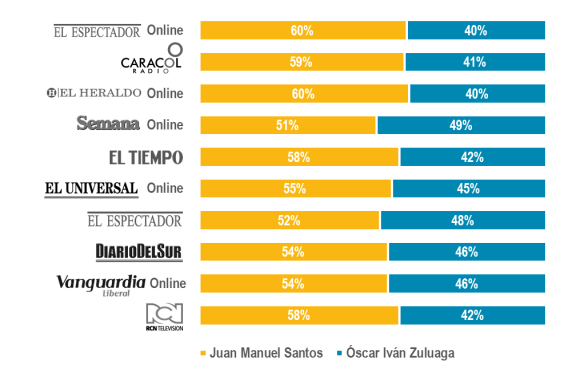 Al Hablar de elecciones, del 43.7% de menciones al candidato de la Unidad Nacional, 43% son críticas a su reelección, concentradas en su mayoría en medios digitales de circulación regional como El Heraldo y La Tarde. Mientras que para Zuluaga el mayor número de menciones negativas se encuentra en medios nacionales como El Espectador y Caracol Radio.