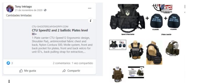 Tony Intriago ofrecía en su facebook personal las promociones de su club de tiro “CTU shooters club”, en el que vende desde ropa hasta chalecos antibalas