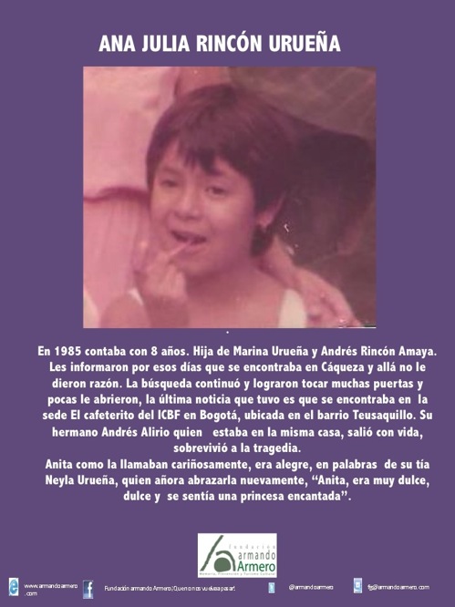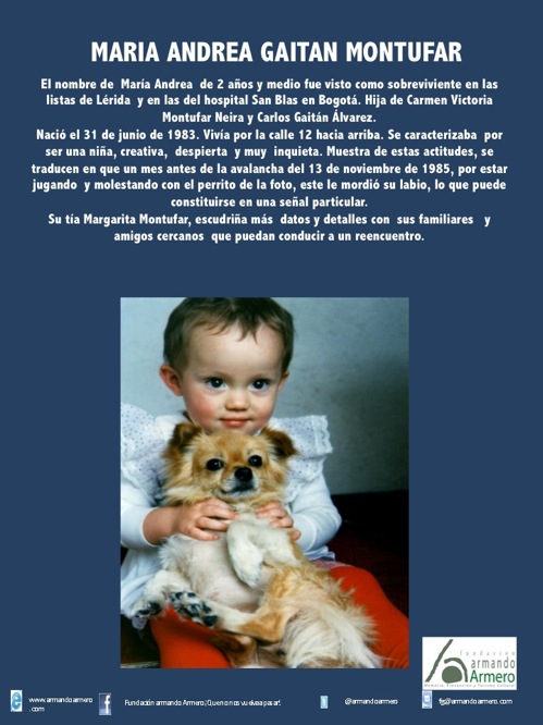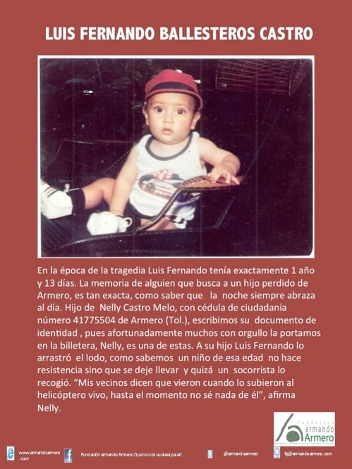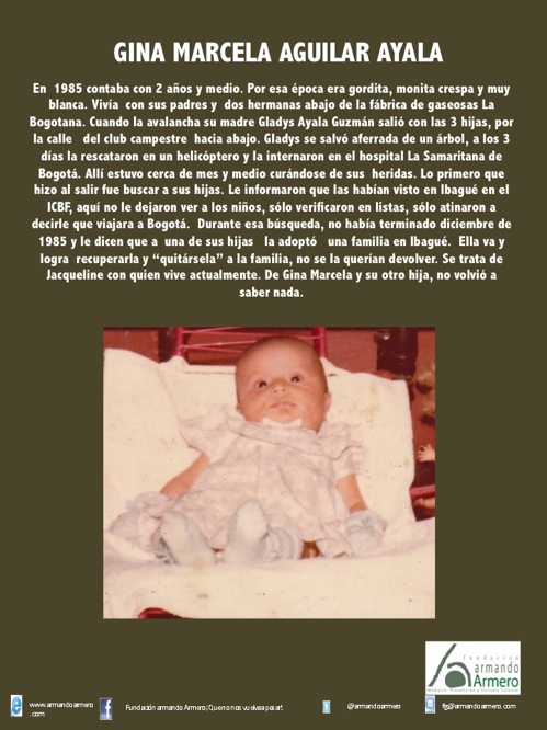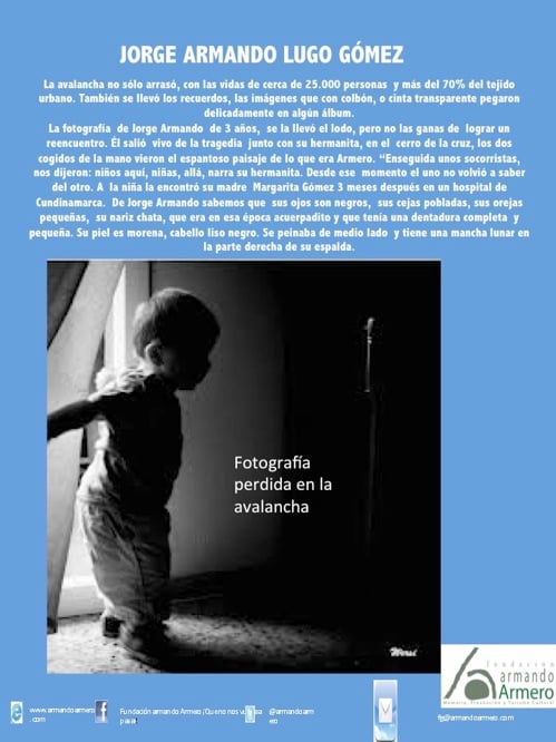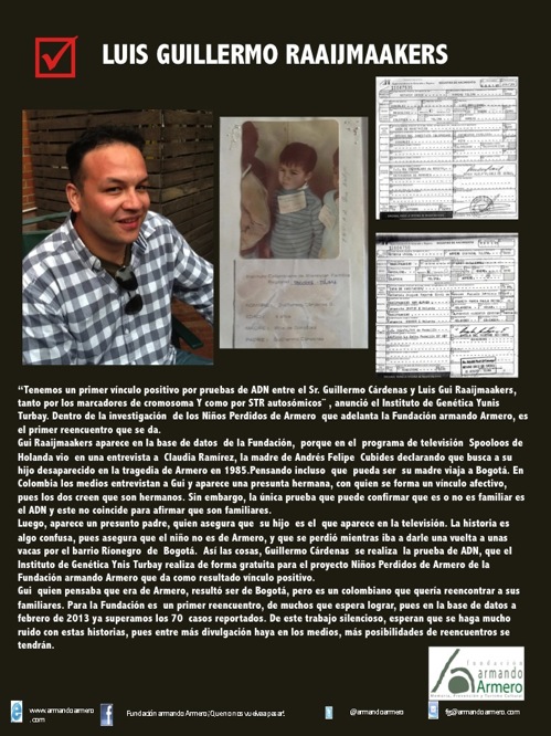 De los más de 200 niños perdidos sólo tres familias se han reencontrado gracias a la Fundación Armando Armero y al científico Emilio Yunis quien ha donado las pruebas de ADN. El llamado Libro Blanco es el resultado de casi treinta años de investigación hecha por Francisco González, un archivo que contradice al Libro Rojo del Bienestar Familiar porque también contiene pruebas que confirman la existencia de muchos niños sobrevivientes de la tragedia.