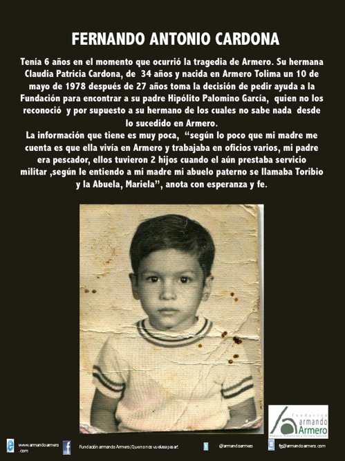 Guillermo Cárdenas fue uno de los niños que posó con los carteles para el registro del Bienestar Familiar. A este niño el ICBF lo etiquetó como nacido en Armero pero resultó ser de Bogotá y fue adoptado por una pareja de holandeses.