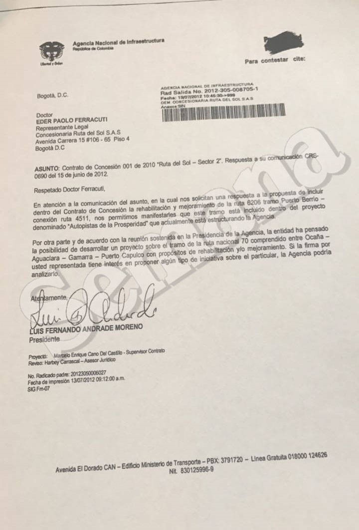 Está claro que la propuesta de la adición de la ruta Ocaña-Gamarra, que no estaba contemplada en el plan inicial que conducía a Puerto Capulca, de propiedad de las Sociedad portuaria de Cartagena donde la familia de la exministra Gina Parody tiene intereses, comenzó cuando el Ministro del transporte era Miguel Peñaloza estaba en el cargo, en el que estuvo solo tres meses, mayo/agosto 2013 y que fue reemplazado por Cecilia Álvarez. El asunto se formalizó con un memorando enviado por Luis Fernando Andrade, presidente de la ANI, a Eder Paolo Ferracuti, representantes de la Concesionaria ruta del sol, en la que Odebrecht esa mayoritario, en la que le pregunta si la Concesionaria estaría interesada en el desarrollo de ese nuevo proyecto.