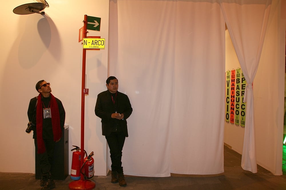 Se les ve deambular, con petos fluorescentes, para hacer una protesta metafórica y hablar con la gente sobre el posconflicto en Colombia. Ayer en ARCO lograron ‘apropiarse’ de una señal de extintores para colgar una matrícula de carro que dice N-ARCO Colombia. Detrás de una cortina que lleva a ninguna parte (y a un costado de la Galería Valenzuela), este par de osados artistas plásticos de la Universidad del Cauca colgaron nueve pendones similares a los de venta callejera de minutos. Se vende vicio, marihuana a $2000, basuco a $1000, perico a $5000…