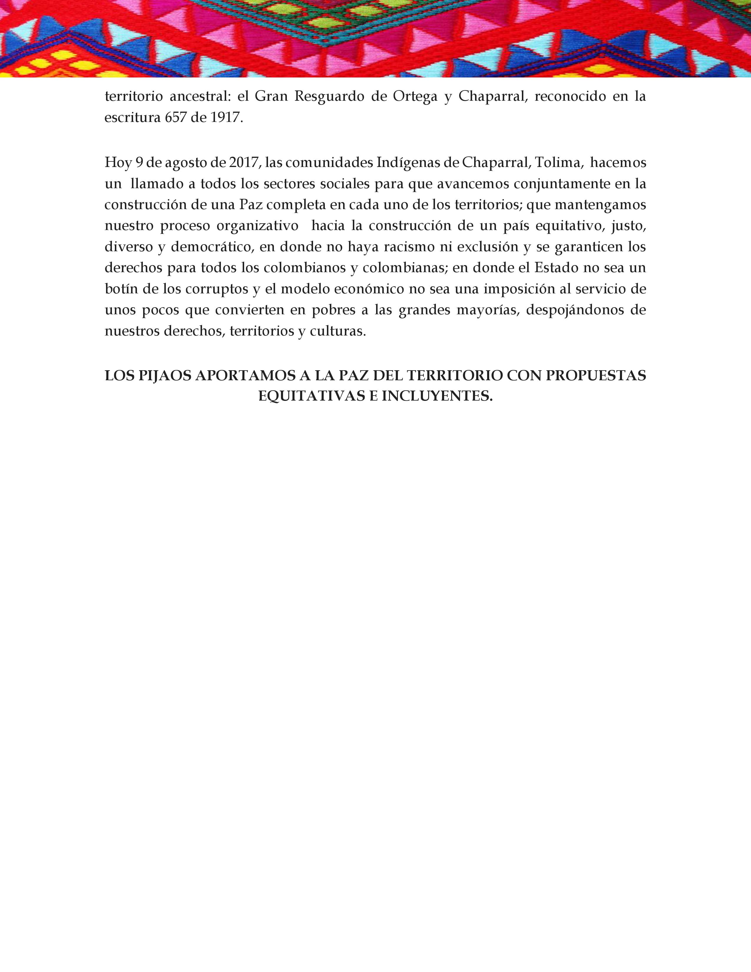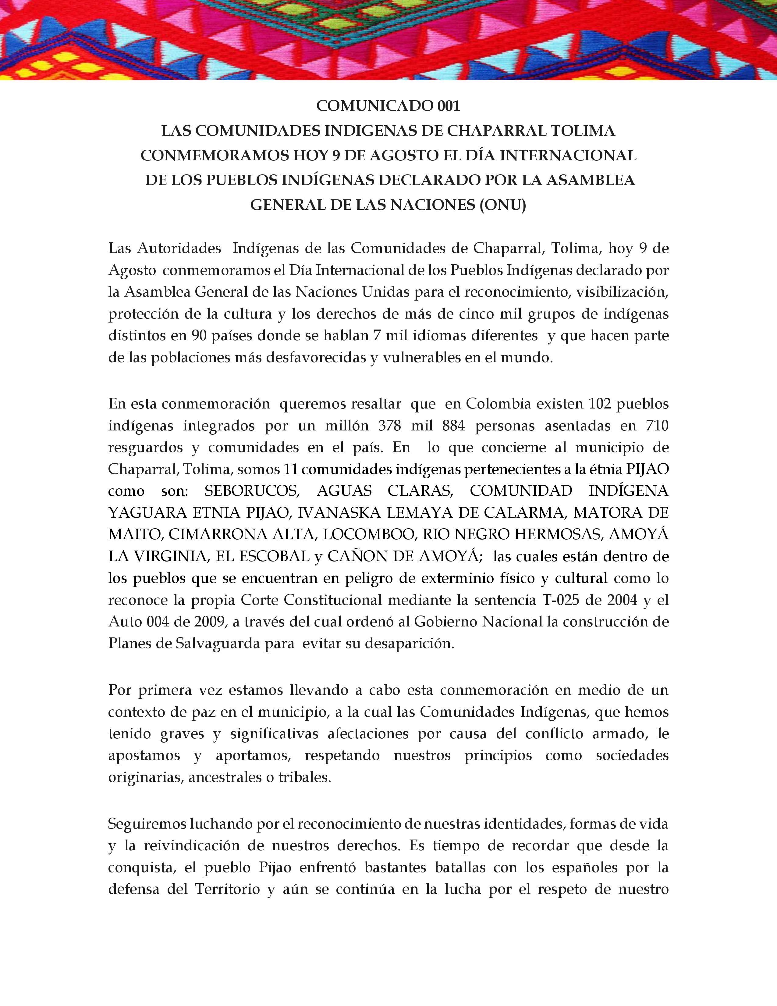 En últimas, el llamado que realizan las comunidades indígenas del Sur del Tolima (pueblo Pijao), y en especial las de Chaparral que declaran “En lo que concierne al municipio de Chaparral, Tolima, somos 11 comunidades indígenas pertenecientes a la etnia PIJAO como son: SEBORUCOS, AGUAS CLARAS, COMUNIDAD INDÍGENA YAGUARA ETNIA PIJAO, IVANASKA LEMAYA DE CALARMA, MATORA DE MAITO, CIMARRONA ALTA, LOCOMBOO, RIO NEGRO HERMOSAS, AMOYÁ LA VIRGINIA, EL ESCOBAL y CAÑON DE AMOYÁ; las cuales están dentro de los pueblos que se encuentran en peligro de exterminio físico y cultural como lo reconoce la propia Corte Constitucional mediante la sentencia T-025 de 2004 y el Auto 004 de 2009, a través del cual ordenó al Gobierno Nacional la construcción de Planes de Salvaguarda para evitar su desaparición”.  Así pues, que esta fecha sea un momento histórico para resignificar las comunidades indígenas del Tolima, para que los de arriban conozcan que los de abajo piensan, sienten, proponen y en lo posibles asume retos desde adentro por construir un buen vivir orientado al servicio, la unidad, la cultura y la reivindicación de los tejidos comunitarios en la región.