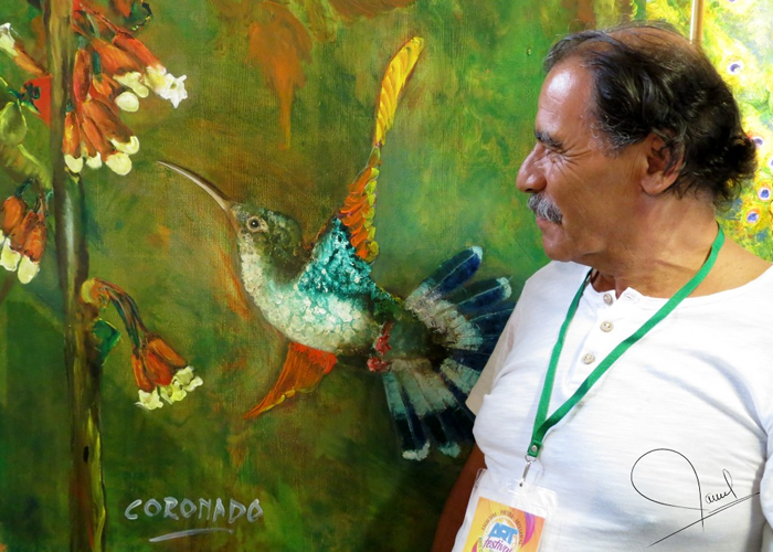 Un asistente al evento le pide a Coronado ver una de sus pinturas y discretamente hago mi retirada de su punto de exhibición, mientras los colibríes zumban en sus cuadros.