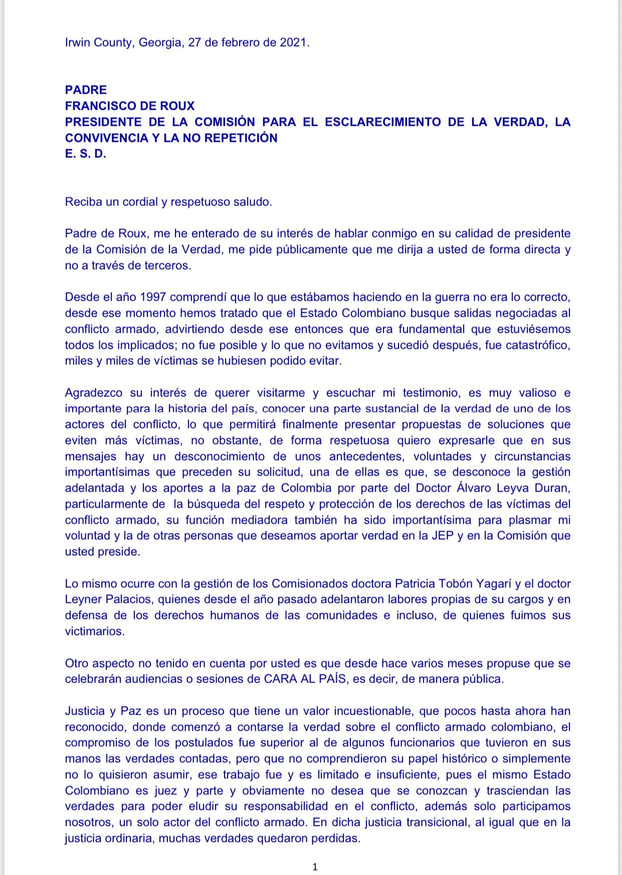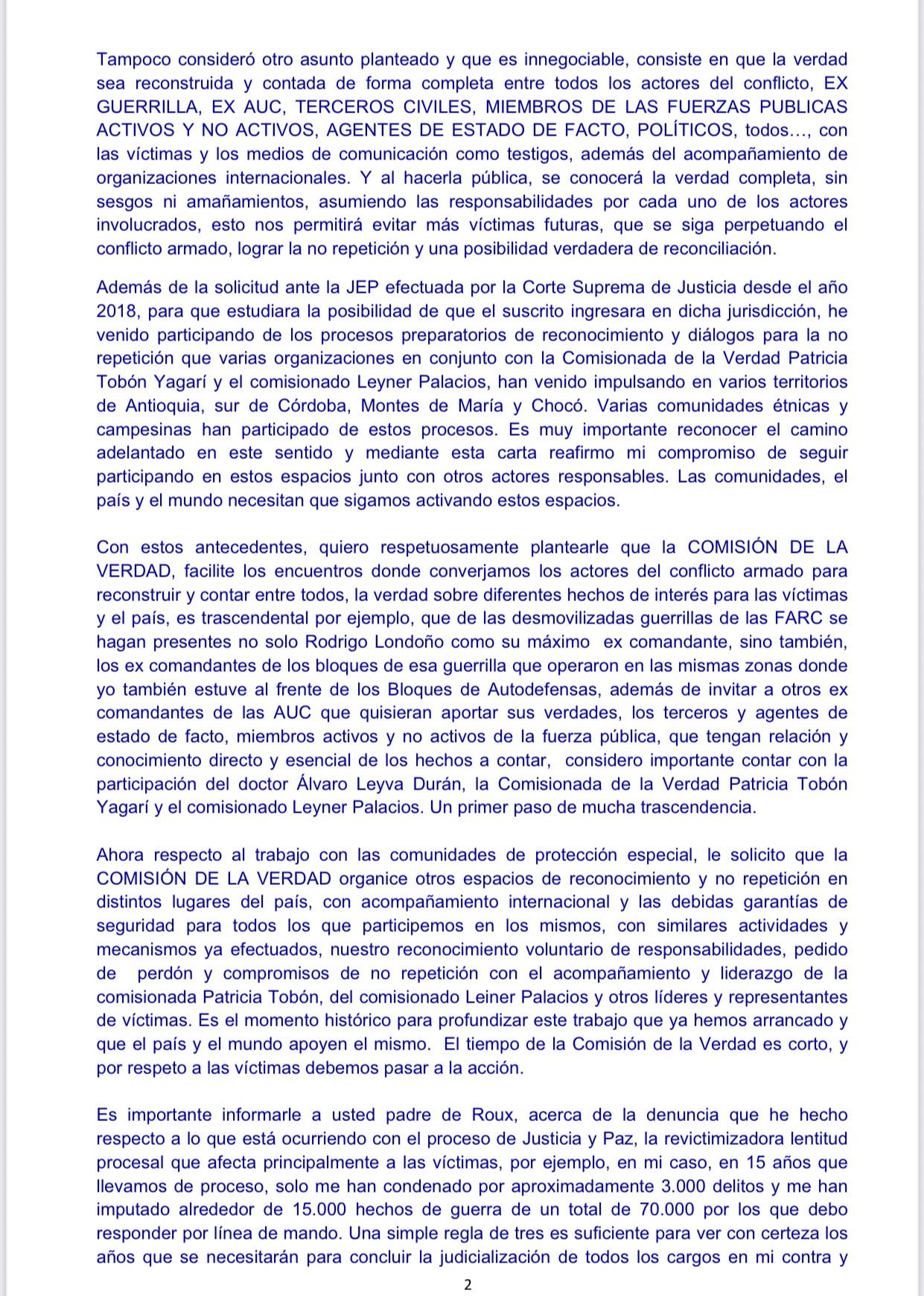 El excomandante de las Farc y el excomandante del Bloque Norte de las Autodefensas, dos superpoderosos de la guerra cuyos ejércitos se enfrentaron a muerte, quieren contar la verdad. Le enviaron sendas cartas al padre Francisco de Roux, presidente de la Comisión de la Verdad, para que convoque a una reunión en pleno, que además sea pública con presencia de medios de comunicación nacionales, extranjeros y con previa invitación a múltiples organizaciones defensoras de derechos humanos.