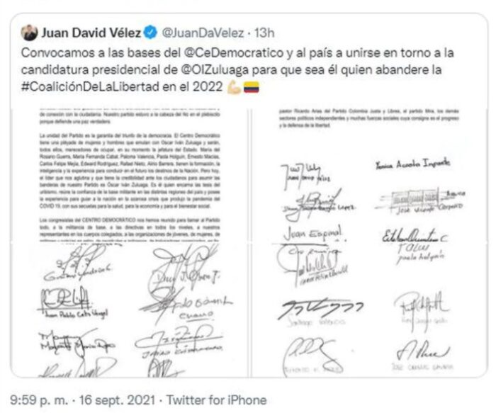 El encargado de hacer publico el pronunciamiento colectivo del CD fue Juan David Vélez, el representante a la Cámara por los colombianos en el exterior y vocero de la colectividad. Al trino que incluía la carta y con el que se hace un llamado a las bases democráticas del partido para apoyar a Zuluaga, fueron muchos los seguidores que se pronunciaron a favor de la candidatura de María Fernanda Cabal y esta se pronunció de frente al respecto: “Apreciado Juan David Vélez, me uno a los comentarios de los simpatizantes sobre tu trino. Es a ellos a quienes debemos escuchar ésta vez"