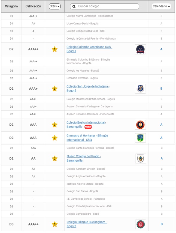 La clasificación de la firma Sapiens, hecha entre más de 13 mil colegios públicos y privados de todo el país mostró entre los 10 primeros a siete colegios de Bogotá, que por varios años han liderado la lista de mejores; estos son: Liceo Campo David, Colegio Colombo Americano CAS, Gimnasio Colombo Británico - Bilingüe Internacional, Colegio los Nogales, Gimnasio Vermont, Colegio San Jorge de Inglaterra, Colegio Montessori British School.
