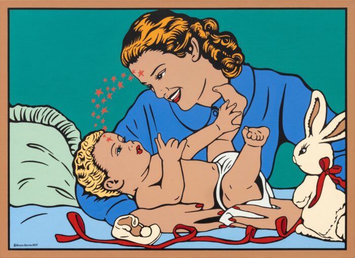 Hay otro lugar donde también viene esa constante de Álvaro Barrios de mirar en los otros mientras se acoplen al yo. Y es cuando retoma de Euguene Delacroix (1798- 1863) del cuadro La libertad guiando al pueblo- del romanticismo francés que es un cuadro histórico sobre la revolución francesa que se encuentra en el museo del Louvre en París. Barrios, tal vez, quiere interrogarse sobre la realidad los nuevos paradigmas de la realidad inmediata. Sobre la identidad, la diversidad y multiplicidad de reunir pensamientos de que tienen que ver con espacios y tiempos. Esa ha sido siempre parte de su creación. Encontrar con el efecto Pop una manera distinta y muy personal de hacer sus apropiaciones.