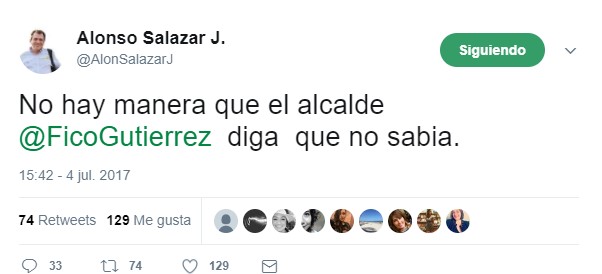 Con conocimiento de causa por haber sido alcalde de Medellín, y antes secretario de gobierno de Sergio Fajardo en tiempos de la desmovilización de los Paramilitares en Medellín, Alonso Salazar publicó este trino "No hay manera que el alcalde Federico Gutierrez diga que no sabía" con el que busca tirarle un dardo al alcalde con quien ha mantenido distancia por el manejo de la seguridad.
