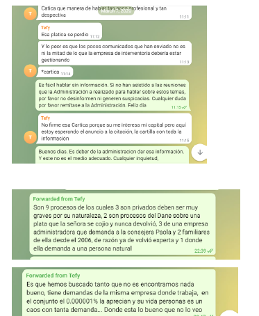 Además de insultos y malos tratos, he sido acusada de robar, de recibir coimas, de maltratar al personal que presta sus servicios en el conjunto, de cometer actos de corrupción. Se ha dicho que he sacado información de la empresa en la que trabajo (una empresa del Estado) sobre los copropietarios del conjunto para sacar provecho de esto, exponiéndome a que se me abra un proceso disciplinario como funcionaria pública que soy.
