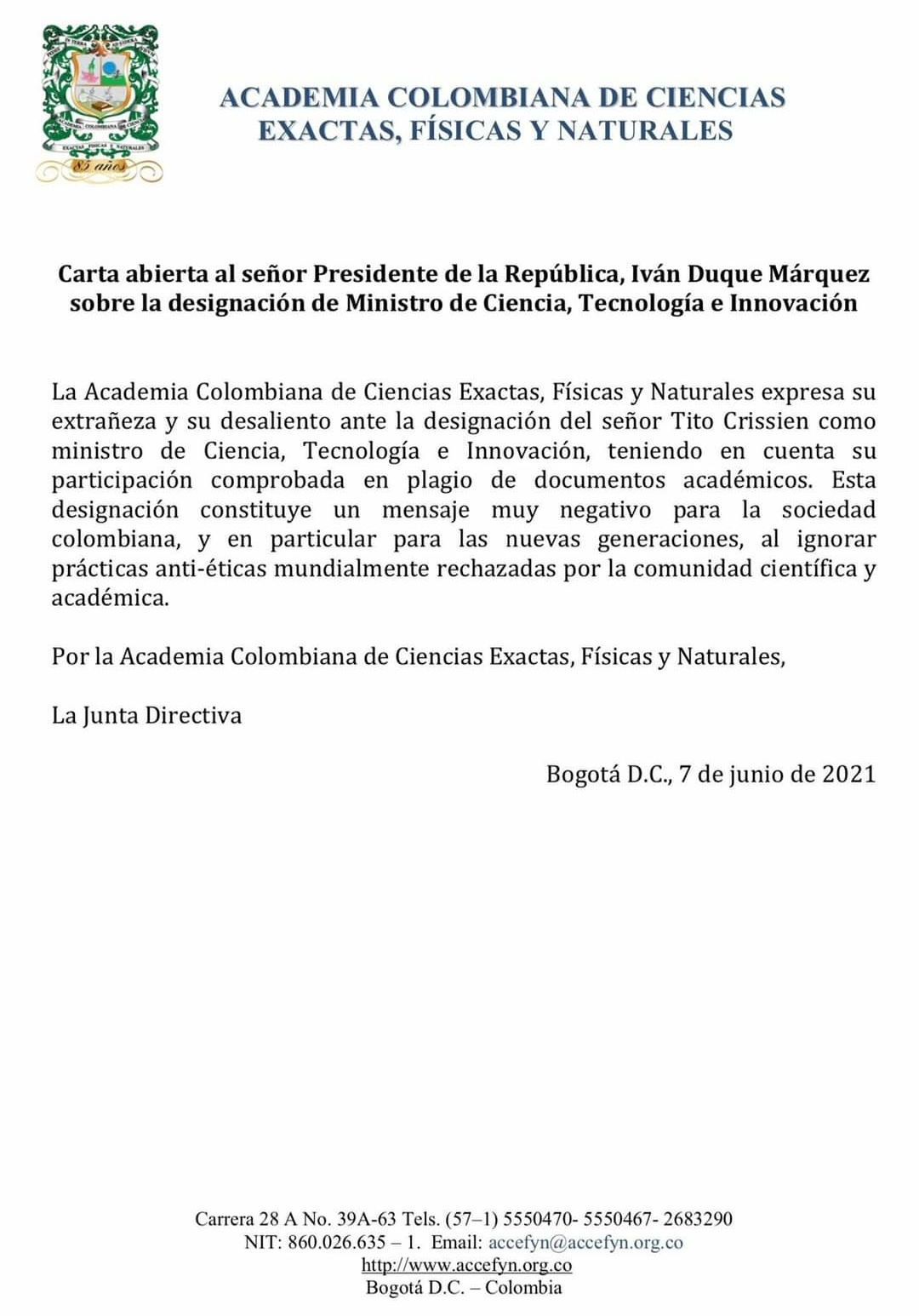 Esta es la carta de la Academia Colombiana de Ciencias firmada por su junta directiva.