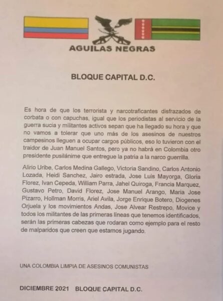 “Es hora de que los terroristas y narcotraficantes disfrazados de corbata o con capuchas, igual que los periodistas al servicio de la guerra sucia y militantes activos sepan que ha llegado su hora y que no vamos a tolerar que uno más de los asesinos de nuestros campesinos lleguen a ocupar cargos públicos”, sentencia el nuevo panfleto emitido presuntamente por el grupo armado ilegal llamado Águilas Negras.