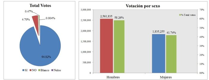 El evento electoral contó con una gran acogida dentro de la población, la participación superó así el 70% (72,27%) de los ciudadanos habilitados para sufragar; de los 5.386.981 electores que conformaban el padrón electoral, un total de 4.397.090 personas ejercieron su derecho al voto, en el que los resultados por el sí superaron en gran medida a su contraparte sumando 4.169.294 sufragios, mientras que por el no solo alcanzaron los 206.864, entre tanto los votos en blanco reunieron 20.738 y nulos solo 194 (González, 1997. p. 156).