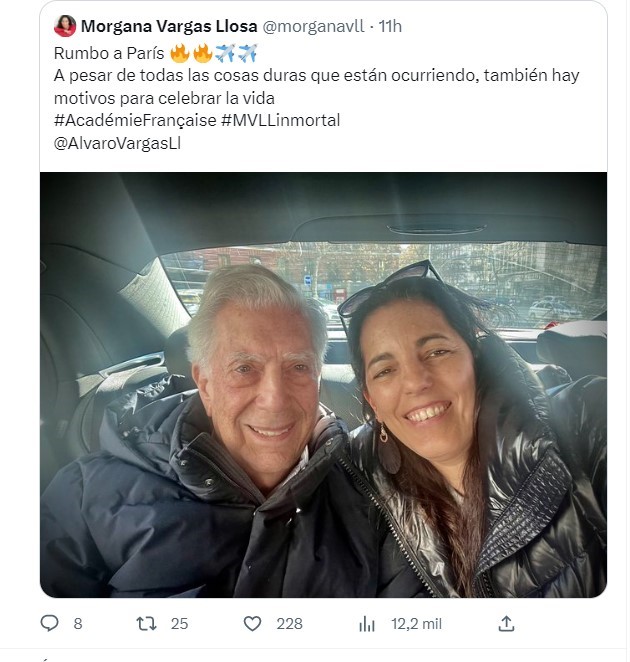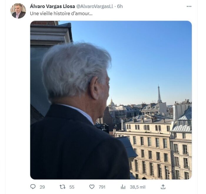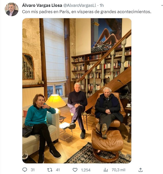 Los dos escritores que más han influenciado al peruano son Flaubert y Victor Hugo. Sobre este último Vargas recordó en un artículo en El País que, cuando se lanzó la segunda edición de los Miserables, una horda de fanáticos entró a la fuerza a una librería en París para quedarse con uno de los volúmenes. Esa época, en donde los literatos eran los rockstar, ha muerto –incluso ya no hay rockstar- Por eso es tan importante que Vargas Llosa, a los 86 años, siga dando guerra, que su fama trascienda más allá de lo literario ya que, desde que escribió a comienzos de este siglo La fiesta del chivo, no ha escrito nada importante, es vital para la buena salud de la literatura. Así que hay que celebrar a Vargas Llosa no sólo en sus novelas de ficción sino en su trepidante historia real que, parece, se abre a la reconciliación final con esta foto que publicó su hijo Álvaro en su cuenta de Twtiter: