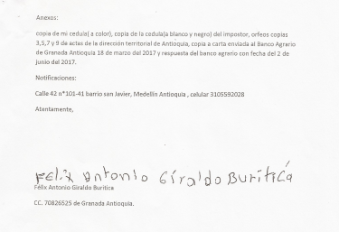 Desde la Unidad de Víctimas, esta abogada,  llamó a Felix Giraldo en siete ocasiones para que llevara las copias y toda la información de la denuncia a esta institución. Sin embargo, Felix, quien solo hizo hasta primero de primaria, no confía en esta institución y espera que las autoridades tomen cartas en el asunto y apliquen los correctivos pertinentes para las personas implicadas en este caso de corrupción.