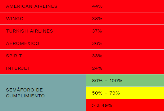El ranking con el porcentaje de cumplimiento de las aerolíneas, según la entidad, es el siguiente: