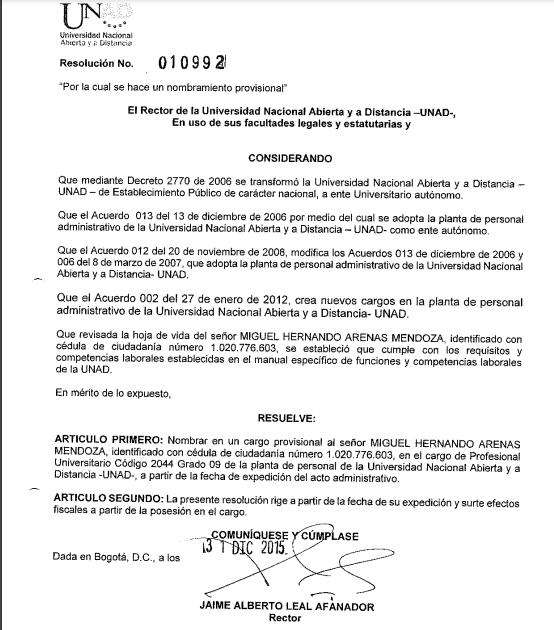Pero no acaba ahí. Una vez levantaron la sanción, en 2015, Leal nombró en el cargo de profesional universitario a Miguel Arenas Mendoza, en ese entonces novio de su hija María Paula Leal Guerrero, quienes se casaron en 2018. A la fecha el yerno del rector sigue vinculado a la UNAD.