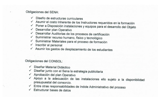 Los tres eran de “convenios de cooperación y aprendizaje”. Hay un punto muy claro que dice “el servicio que presta el SENA es completamente gratuito.” En el caso de la regional Caldas, el contrato deja muy claro que el SENA no solo no cobrará por el trabajo, sino que tampoco recibiría dinero para la ejecución del convenio. Estas son las obligaciones del SENA y de Odebrecht.