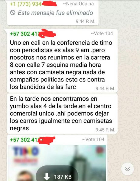 Están tan convencidos de su propósito de presionar para que Timochenko retire su candidatura presidencial que ni siquiera les interesa esconder su identidad. El periodista de Las voces del secuestro Herbin Hoyos reconoció ser el instigador de la rechifla en Armenia, mientras que en Cali, el candidato a la Cámara del Valle por el Centro Democrático Juan José Malvehy García se dejó ver con un megáfono azuzando a la gente con frases desafiantes como Timochenko, “Baje a la calle y le doy en la cara”. En los contactos de Whatsapp del grupo cerrado aparece el número del celular registrado en la página oficial de la campaña del también candidato a la Cámara del CD, Christian Garcés, que tiene el número 104. El personaje en el grupo se identifica con 'Voten 104'.